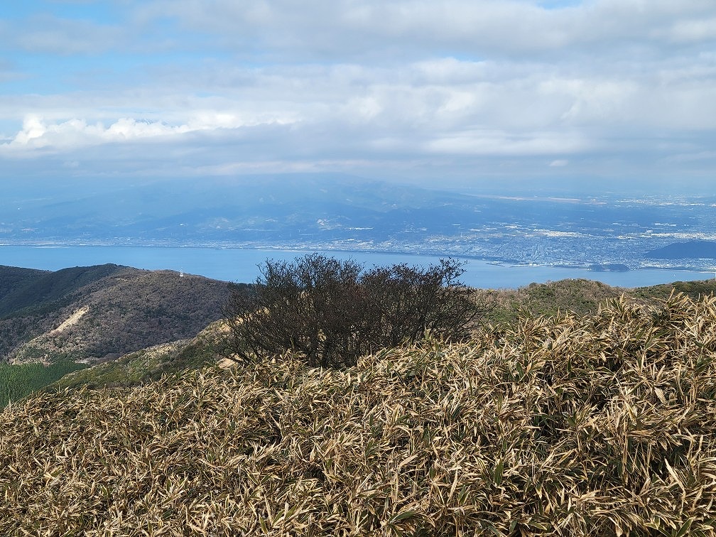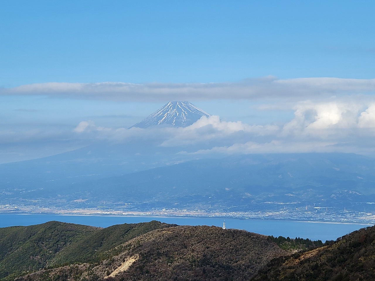 山頂に着くと晴れて来ました。西側の眼下には戸田の集落、同じく西側の遠くには静岡の三保の半島や市街地、西から北側にかけて駿河湾、北東には箱根が見えます。