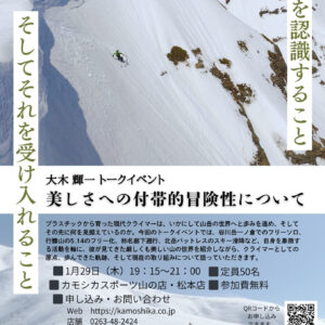 店内には、登山ウェア、登山靴、ザック、登攀具(クライミングギア)、沢登り用品、バックカントリースキー用品、アックス・スクリューなどのアイスクライミング用品、トレイルラン用品等々、季節に応じたさまざまな山でのアクティビティに必要な道具を広く取り揃えており、リラックスした雰囲気の中でゆっくりとお買い物をお楽しみいただけます。冬期は山スキー関連の道具を充実、また、地図・山岳系書籍は地域最大規模の点数を取り揃えております。