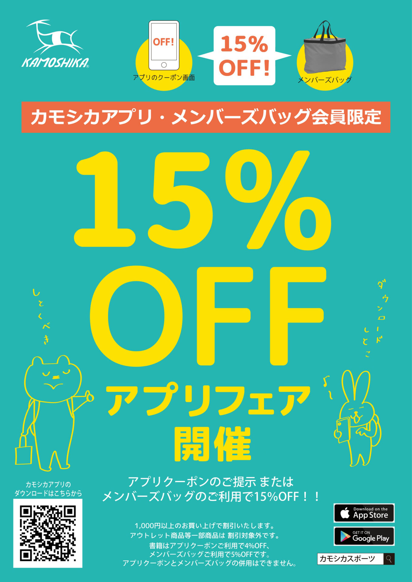 - カモシカスポーツ公式アプリのクーポン画面ご提示またはメンバーズバッグご利用で店頭表示価格より15%割引いたします