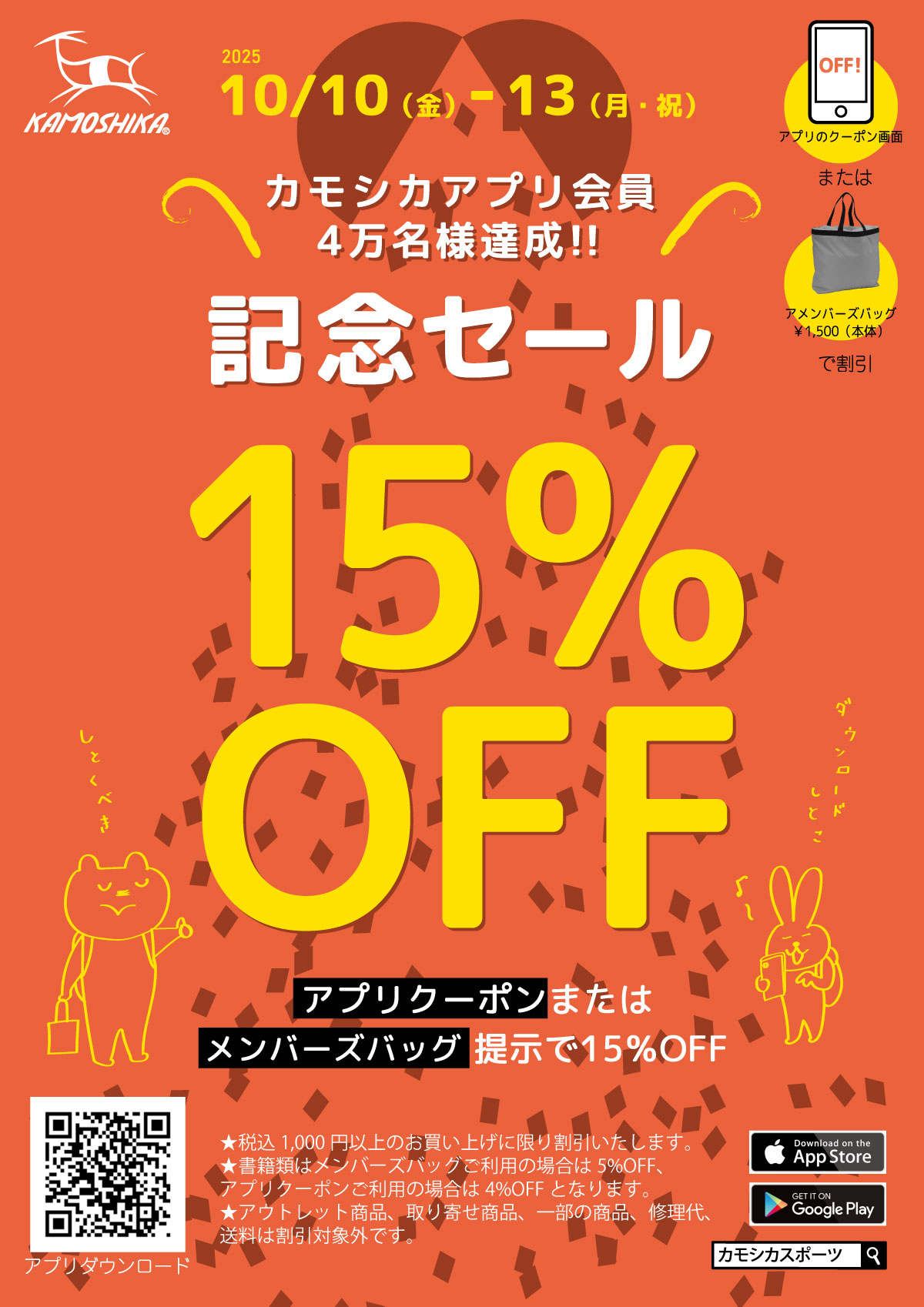 10月10日(金)-13日(月・祝) 15%OFF カモシカアプリ会員4万名様達成記念セール 開催(全店)