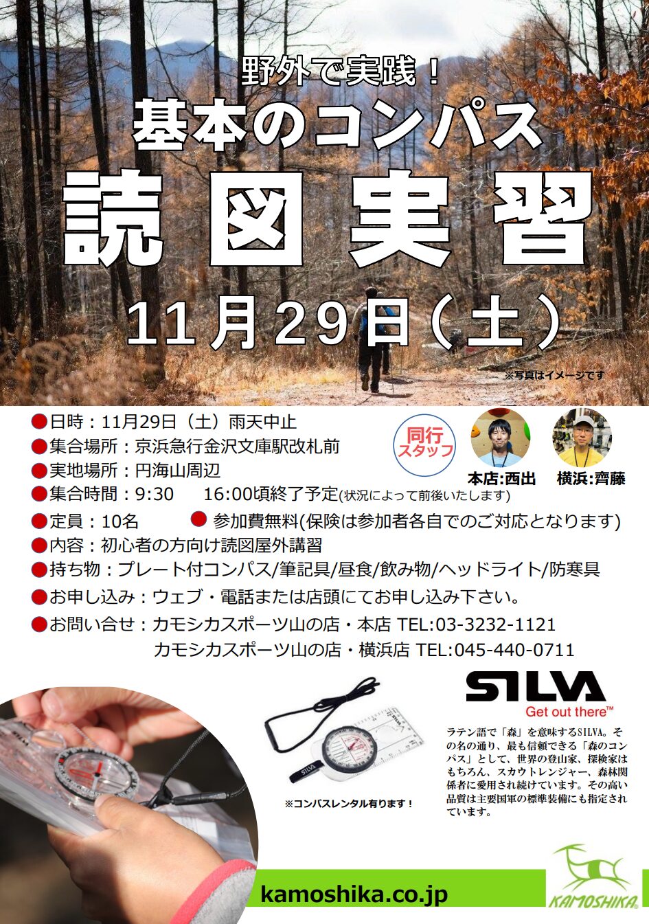 - 持ち物 プレート付きコンパス、筆記具、昼食、飲み物、ヘッドライト、防寒具