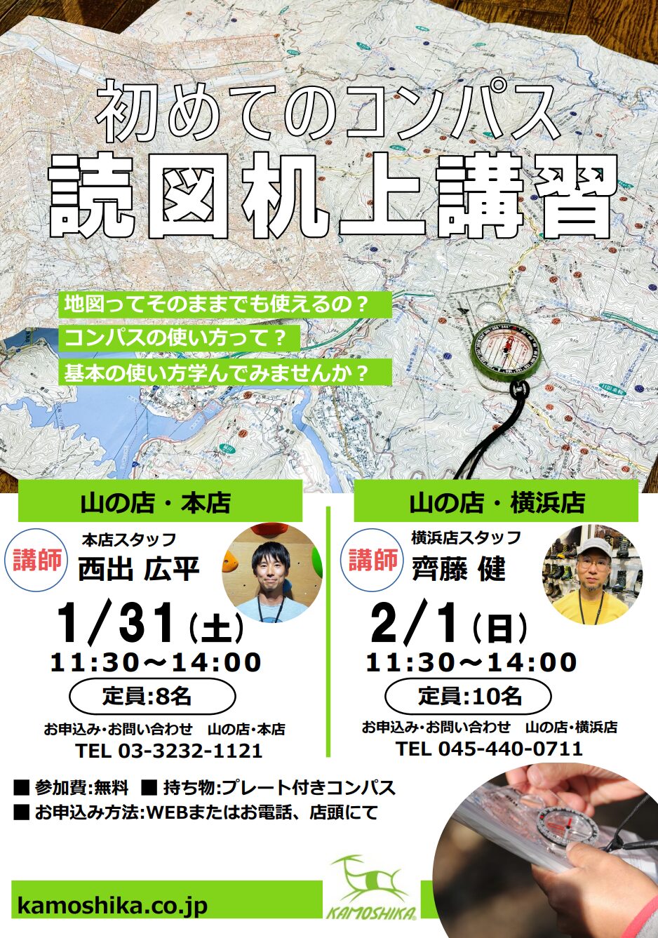 カモシカスポーツ山の店・本店(高田馬場)と山の店・横浜店にて、読図机上講習を開催します。