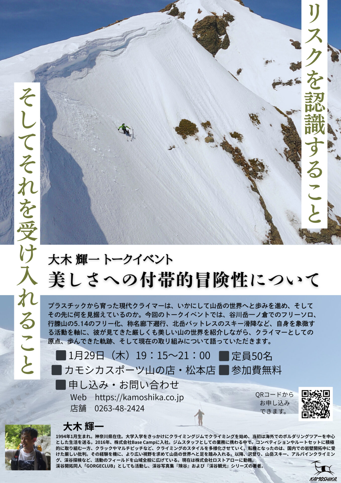 カモシカスポーツ山の店・松本店では、大木輝一氏によるトークイベント「美しさへの付帯的冒険性について」を開催します。
