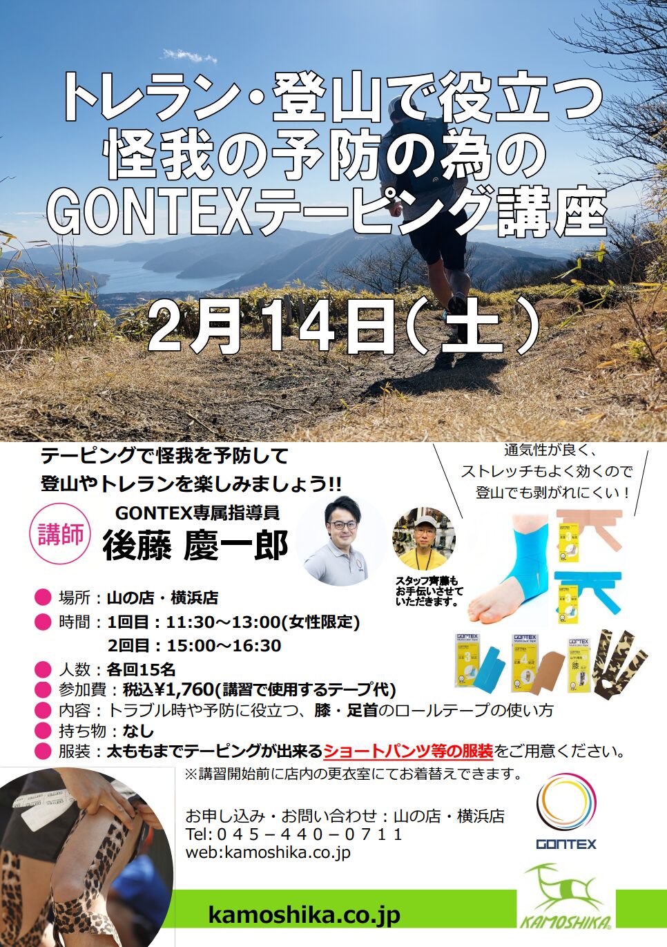 GONTEXテーピング講座(横浜店)2026.01.20ニュース イベント カモシカスポーツ横浜店では、GONTEXテーピング講座を開催します。内容トレラン・登山で役立つ怪我予防のためのテーピング講座(膝足首のテーピング講座)です。講師プロフィールGONTEX専属指導員 後藤 慶一郎(ごとう けいいちろう) ※カモシカスポーツ横浜店スタッフ齊藤もお手伝いさせていただきます。開催店舗・日時山の店・横浜店日時:2026年2月14日(土) 1回目 11:30~13:00 ★女性限定の回です(※講師とスタッフは男性です) 2回目 15:00~16:30 参加費:講習で使用するテープ(税込1,760円)を購入して頂きます。 服装:太ももまでテーピングができるショートパンツ等の服装をご用意下さい ※講習開始前に店内の更衣室で着替えができますお申込み・お問合せWeb、店頭、電話にて受け付けます(定員に達し次第、受付を終了します) 募集人数:各回15名 締切:2月12日(木) 19:00横浜店(1回目 受付) ★女性限定横浜店(2回目 受付)STORE MAP最新のイベント・セール情報をお届けしますカモシカスポーツのイベント・セール情報が最も早いタイミングで届くメールマガジンです。メルマガ登録はこちら Post Share Hatena LINE note 2月開催 テレマークスキー体験会 机上講習&実技講習(松本店)前の記事 アプリ・メンバーズバッグ会員限定 1月23日(金)-25日(日) 10%OFFフェア次の記事