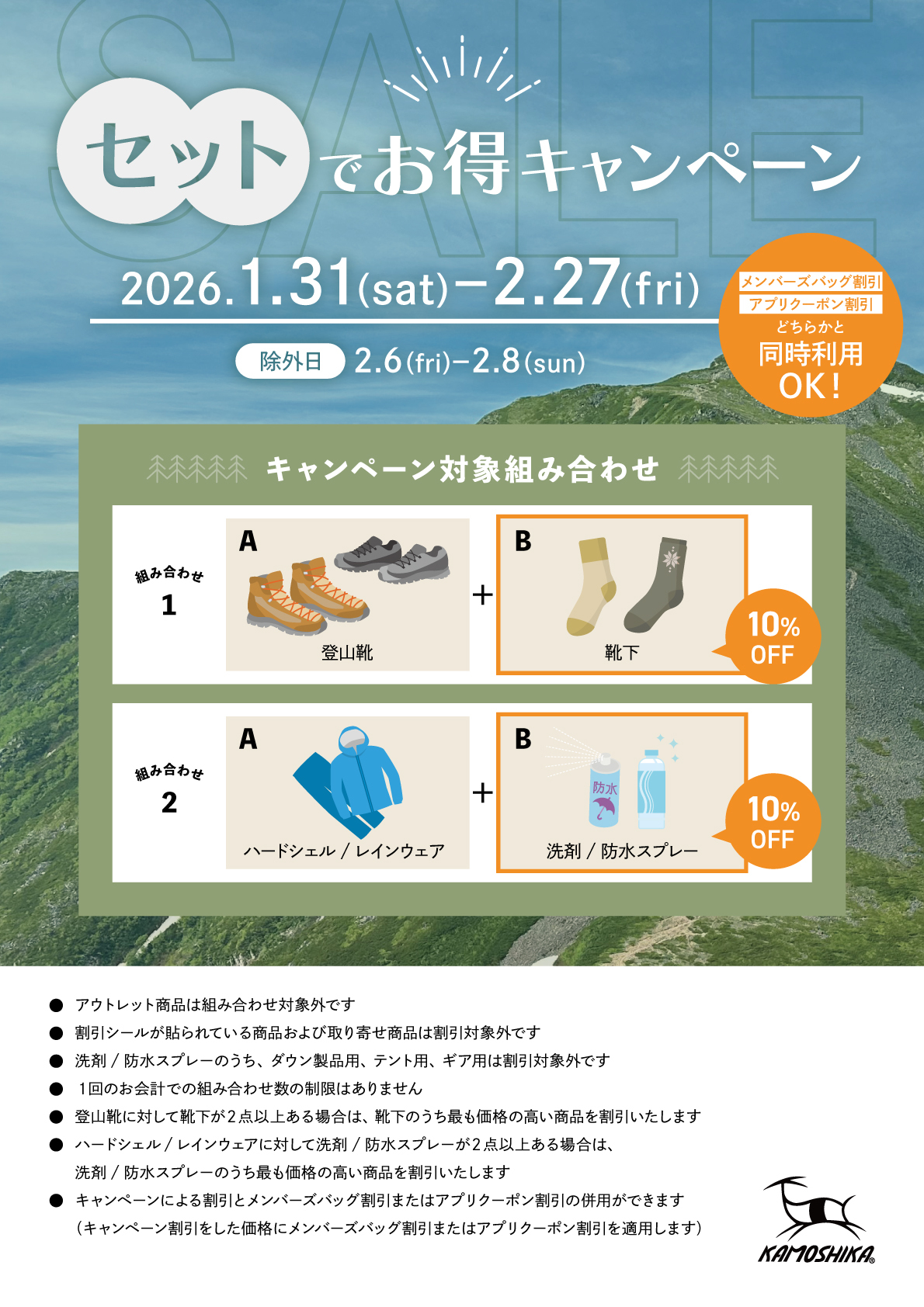 カモシカスポーツでは、1月31日(土)から2月27日(金)まで、指定の商品の組み合わせで割引となる「セットでお得キャンペーン」を開催いたします。(2月6日(金)~8日(日)はキャンペーン除外日です。ご了承ください。)