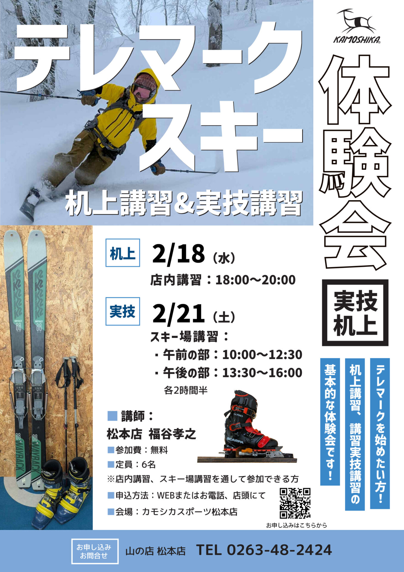 カモシカスポーツ山の店・松本店では「テレマークスキー体験会 机上講習&実技講習(2月開催分)」を開催いたします。