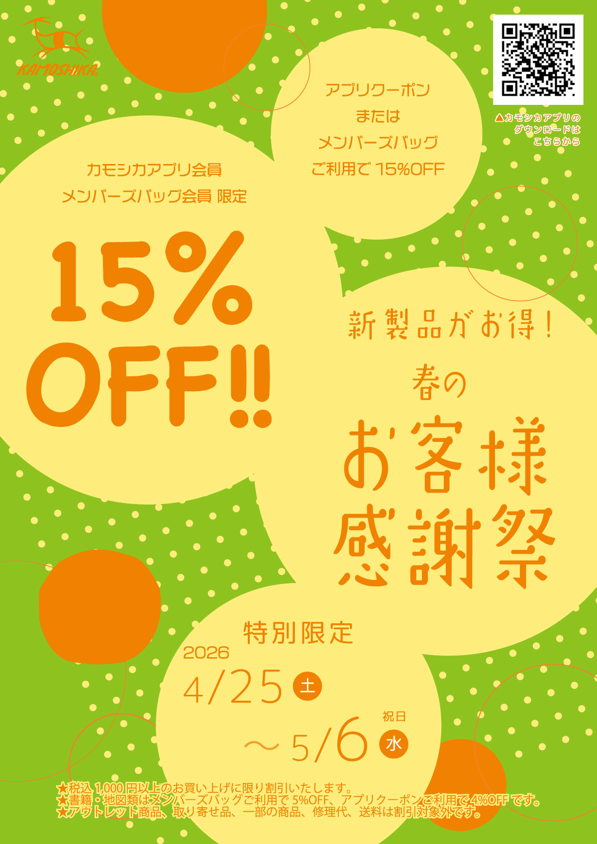 カモシカスポーツでは、4月25日(土)から5月6日(水・祝)まで、メンバーズバッグ会員・アプリ会員限定「新製品がお得!春のお客様感謝祭」を開催いたします。メンバーズバッグまたはアプリクーポンのご利用で15%OFFいたします。