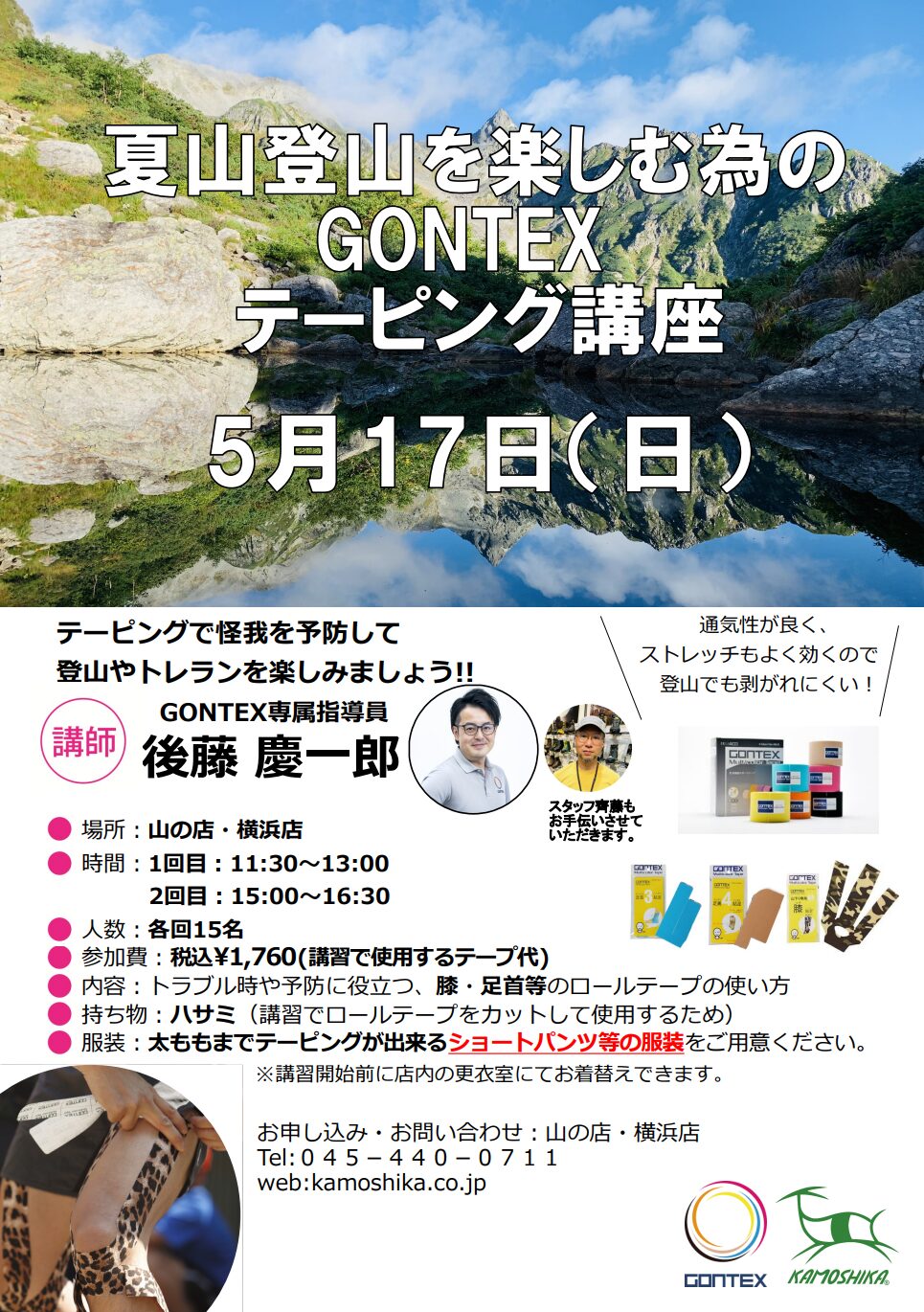 カモシカスポーツ横浜店では、夏山登山を楽しむためのGONTEXテーピング講座を開催します。