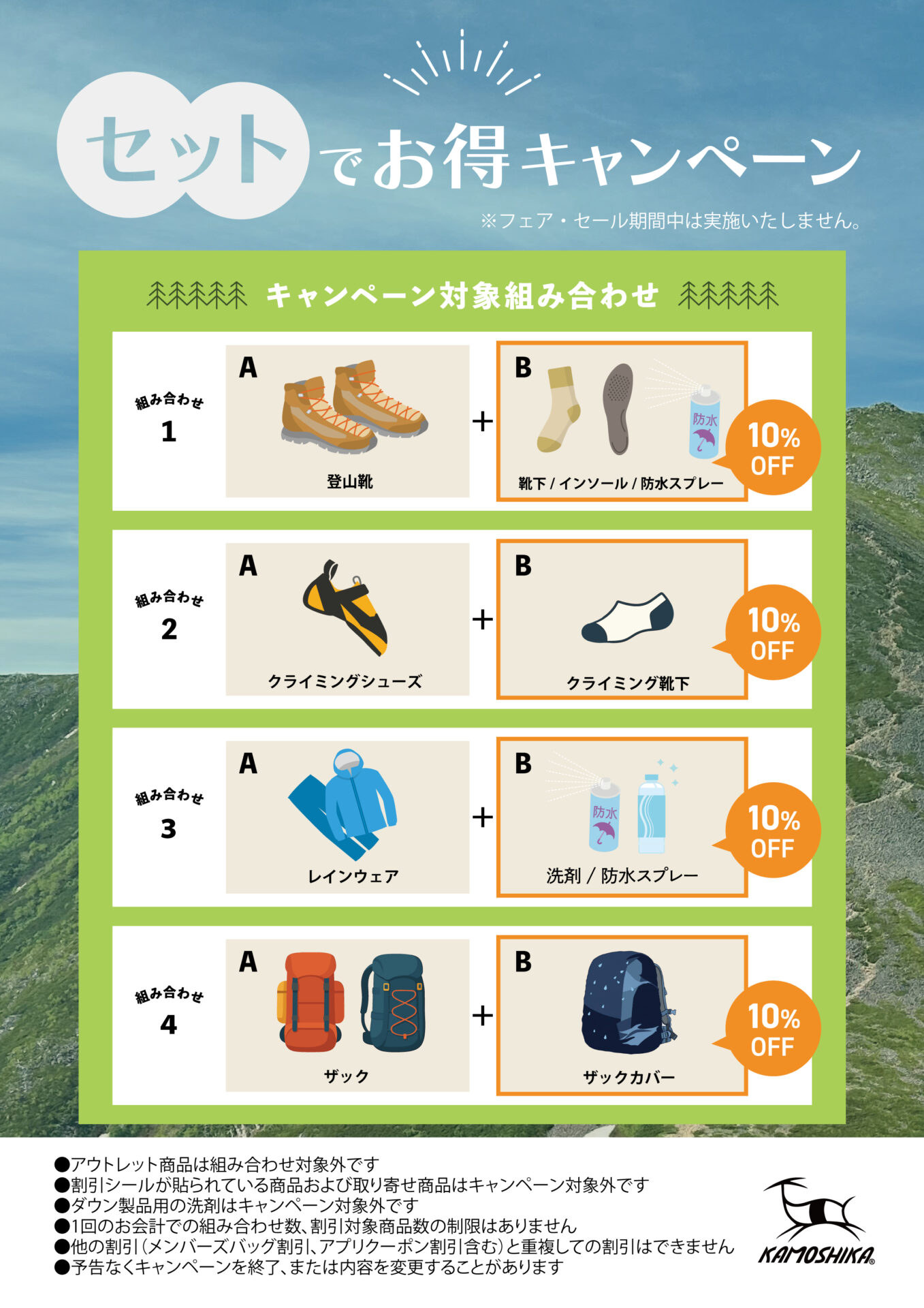 カモシカスポーツでは、指定の商品の組み合わせで割引となる「セットでお得キャンペーン」を開催いたします。フェア・セール期間を除いて通年開催いたします。